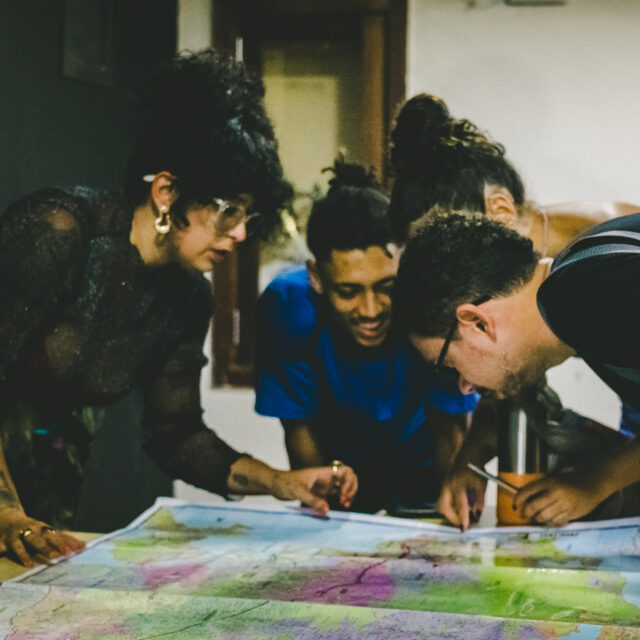 Utilizando la memoria, la oralidad y lo cotidiano como ejes orientadores, y mediante la combinación de lenguajes, propusimos a los participantes la posibilidad de apropiarse de modos de hacer en un proceso interactivo. Una de las características del proceso es la articulación de saberes individuales y, a partir de un conjunto de técnicas artísticas, la intervención colectiva en el territorio de manera inventiva. Se trata de una propuesta estructurada a partir de la idea de una ciudad constituida por una red de relaciones tejida por sujetos que reformulan cotidianamente las fronteras entre territorio, casa y calle, lo real y lo virtual.